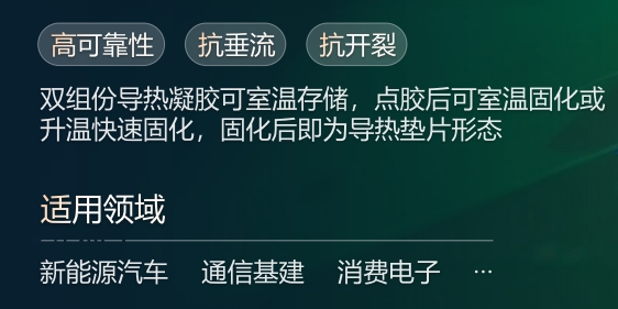 高可靠性、抗垂流、抗開(kāi)裂、雙組份導(dǎo)熱凝膠可室溫存儲(chǔ),點(diǎn)膠后可室溫固化或升溫快速固化,固化后即為導(dǎo)熱墊片形態(tài)